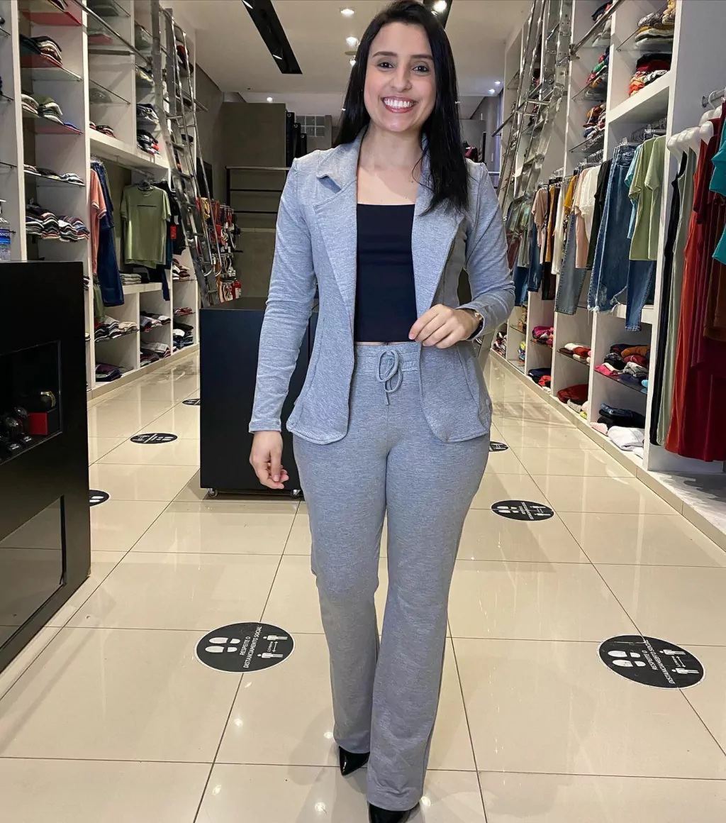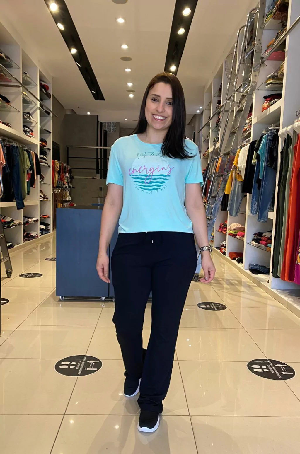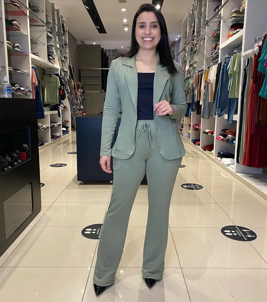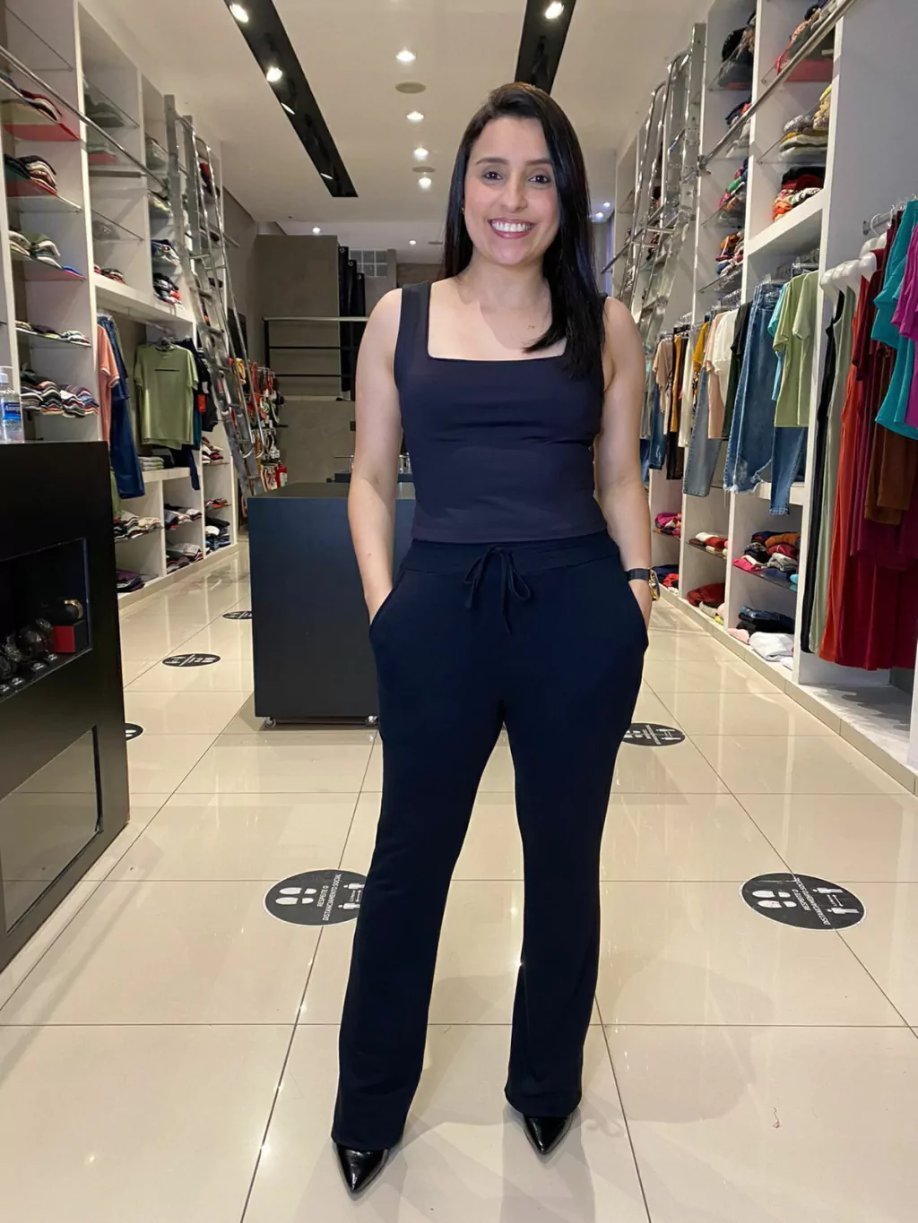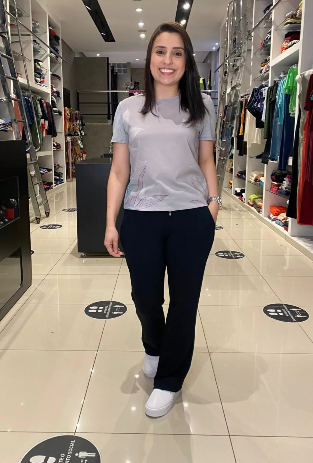 A Calça Jordana é fabricada em moletinho de viscose com elastano que tem um caimento perfeito, seu corte levemente flare (pernas com a boca mais soltinha), a peça tem bolsos e elástico na cintura ,podendo ser usado com salto ou mesmo com um tênis se tornando assim uma peça coringa para o seu closet .