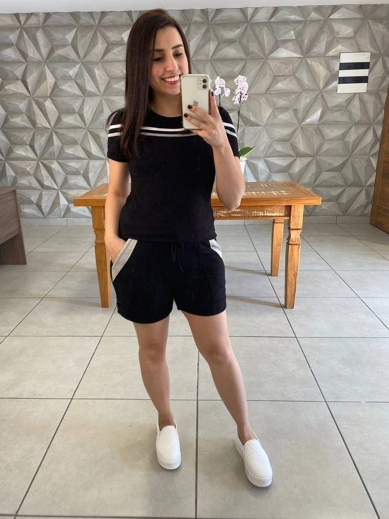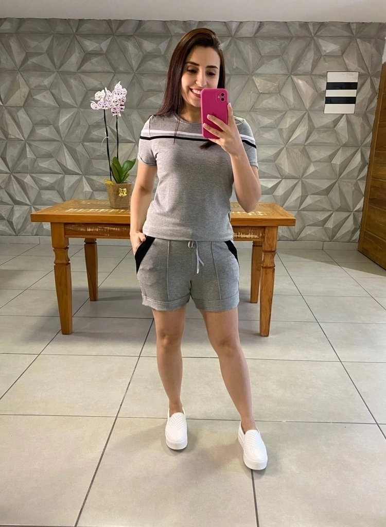 O Conjunto Emanuelle é fabricado em moletinho 97% Viscose e 3% elastano , proporcionando muito estilo e conforto para o seu look.A blusinha contem detalhe de listras e o shorts com elástico na cintura e também bolsos .