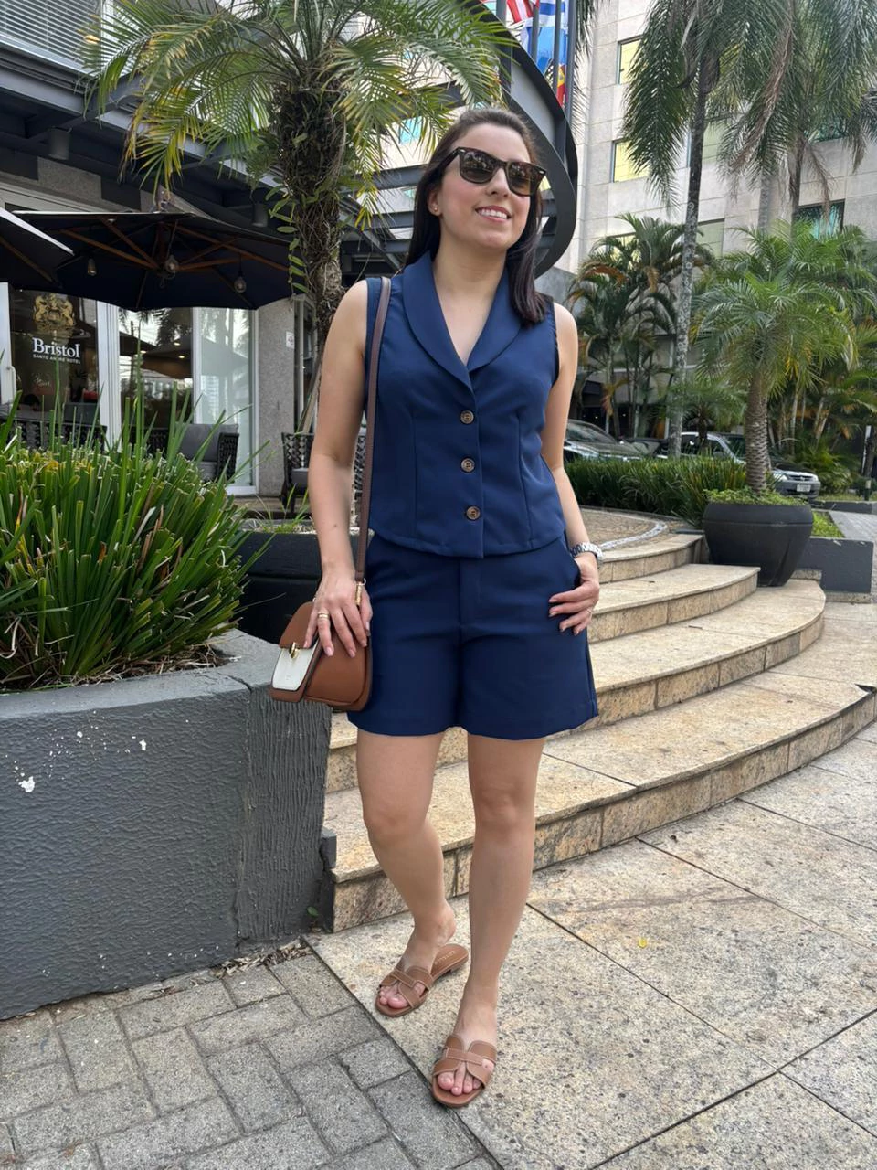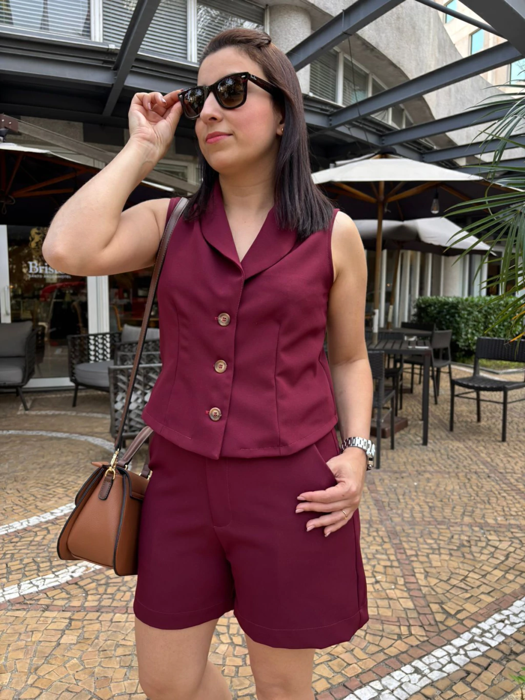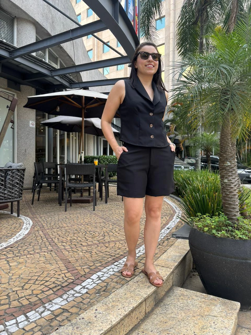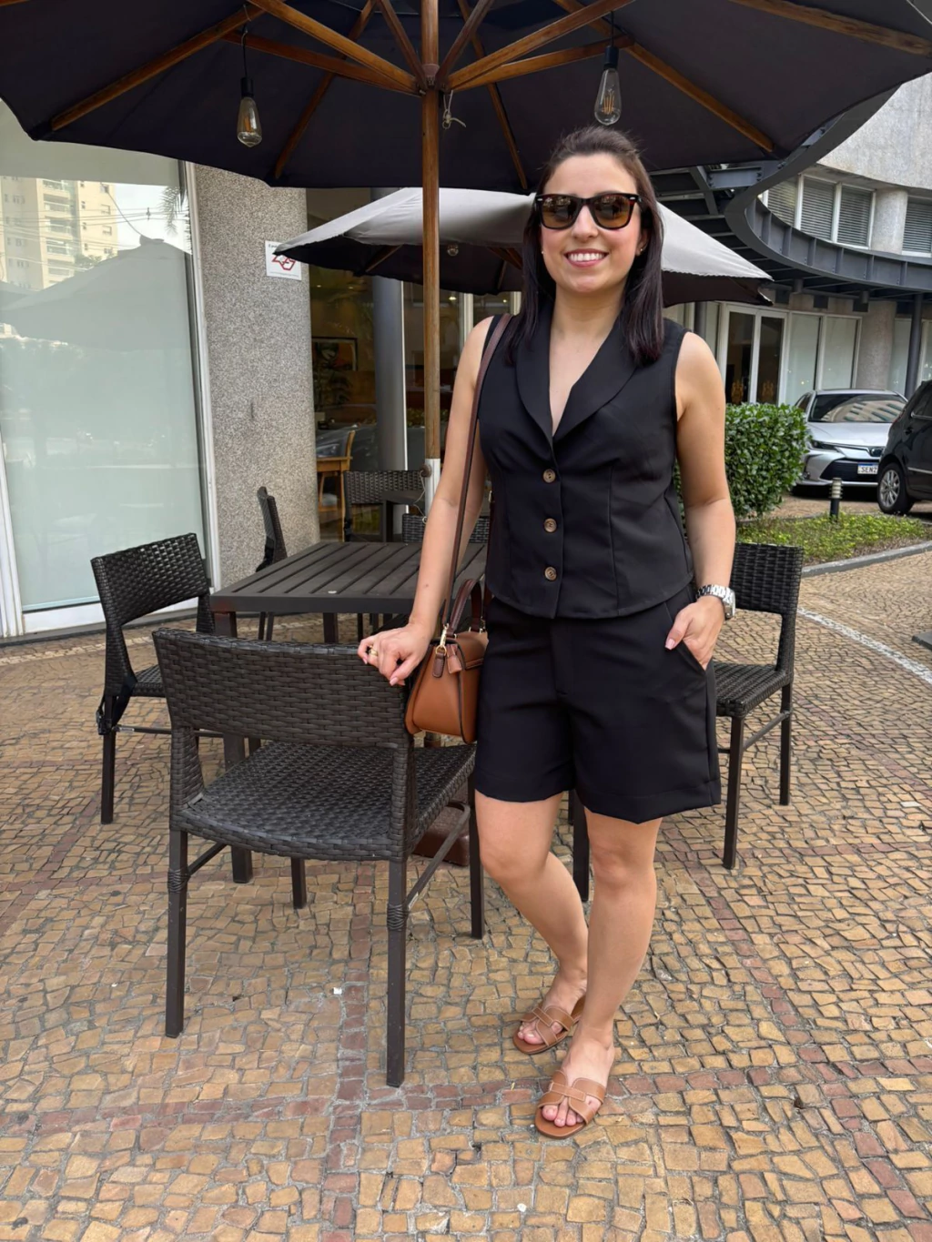 O colete, com seu design clássico com botões, valoriza a silhueta e traz um charme irresistível ao look. Já o shorts, com fechamento prático em zíper e botão, oferece liberdade de movimento sem abrir mão da elegância.