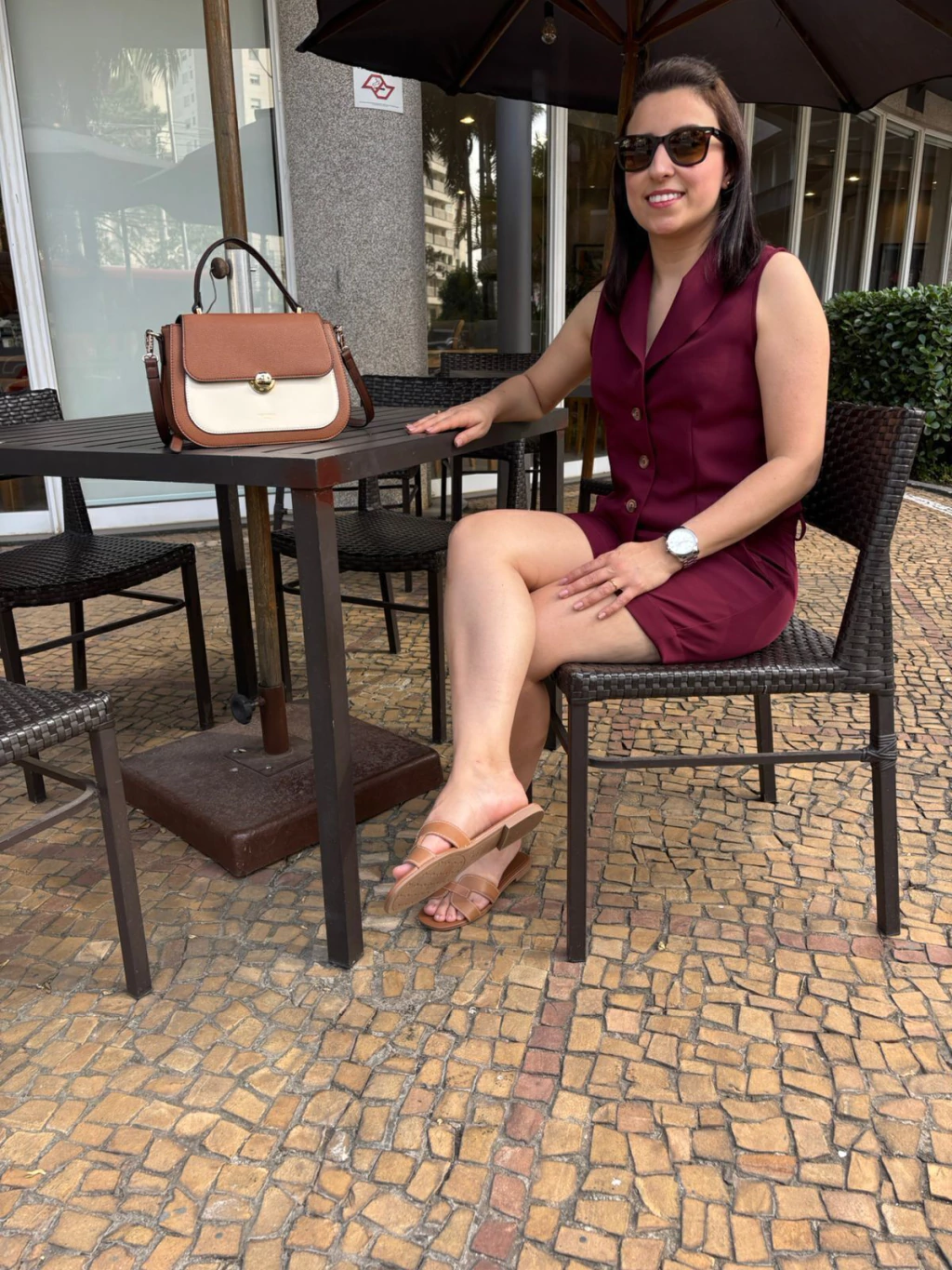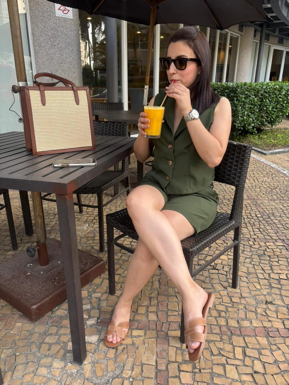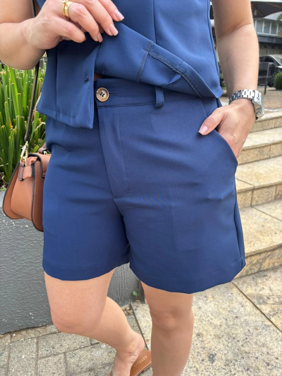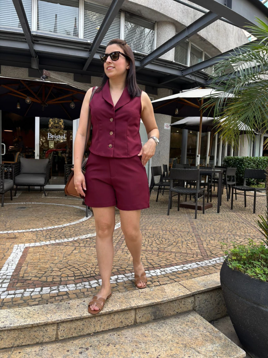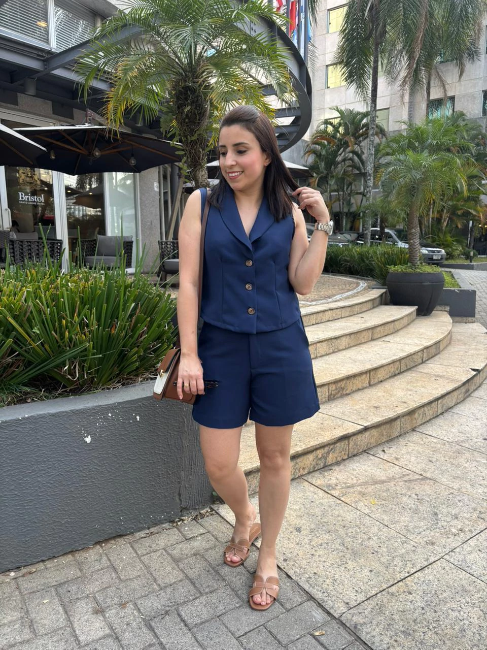 O colete, com seu design clássico com botões, valoriza a silhueta e traz um charme irresistível ao look. Já o shorts, com fechamento prático em zíper e botão, oferece liberdade de movimento sem abrir mão da elegância.