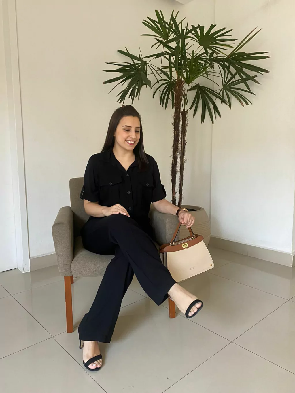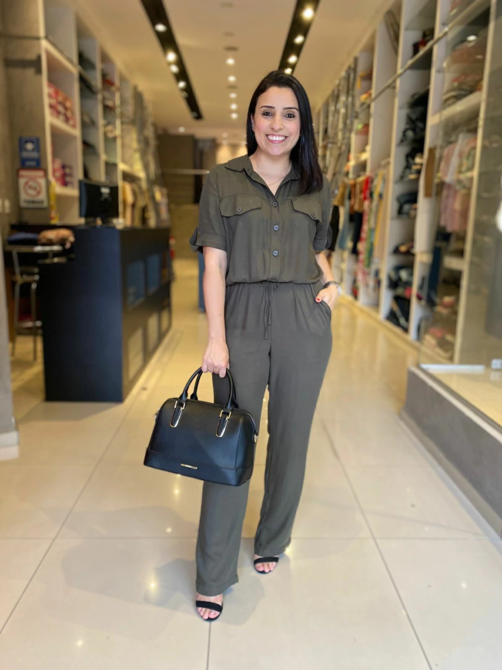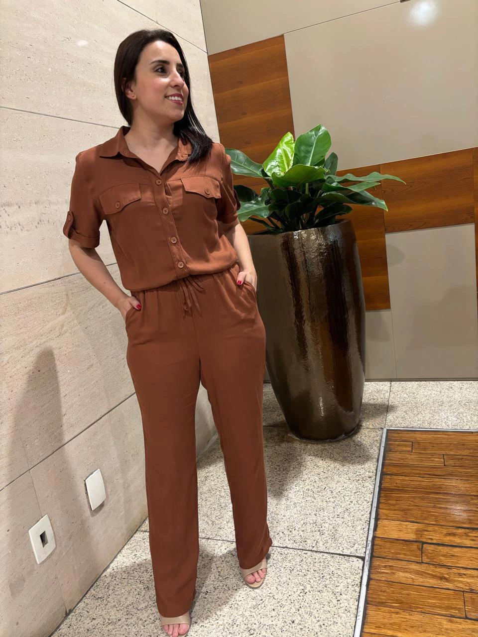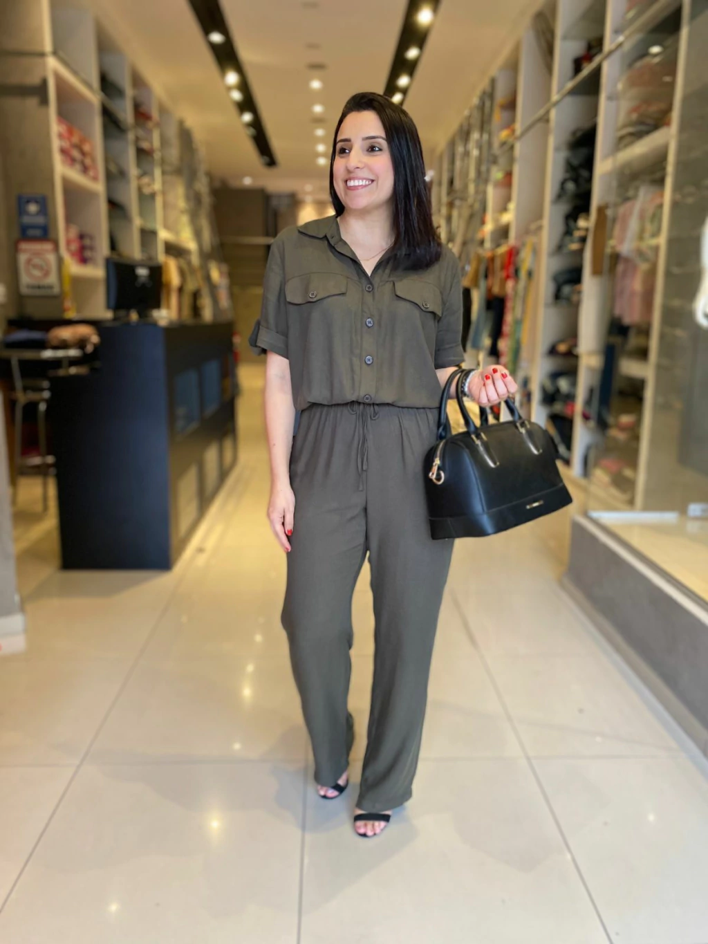 O Macacão Ivy é fabricado em viscose Delta uma viscose mais encorpada com ótimo caimento, tem manguinha e tem elástico na cintura os botões frontais facilitam para vestir .