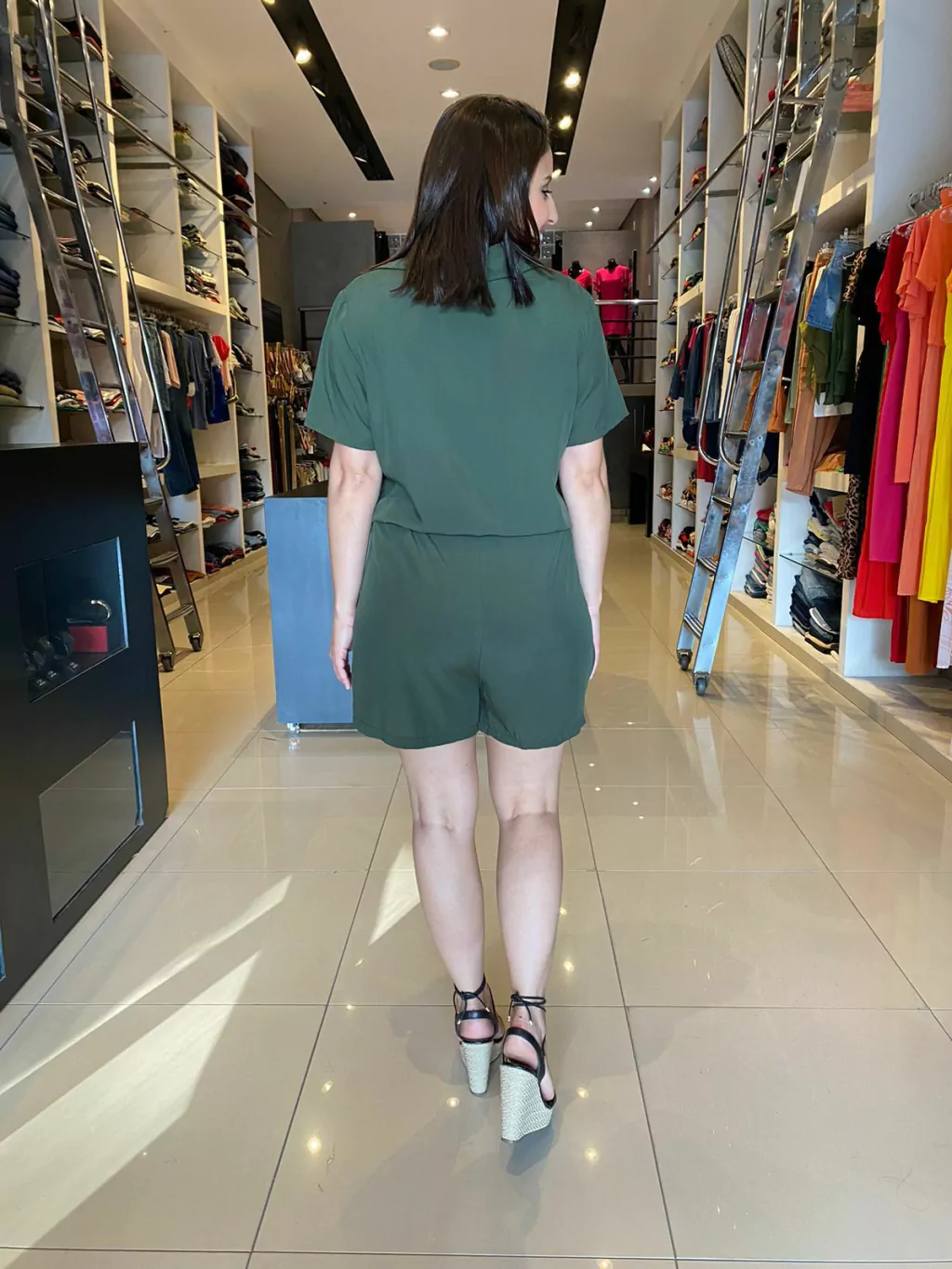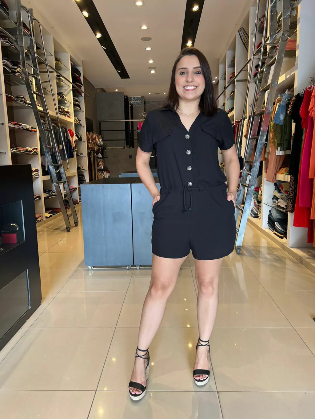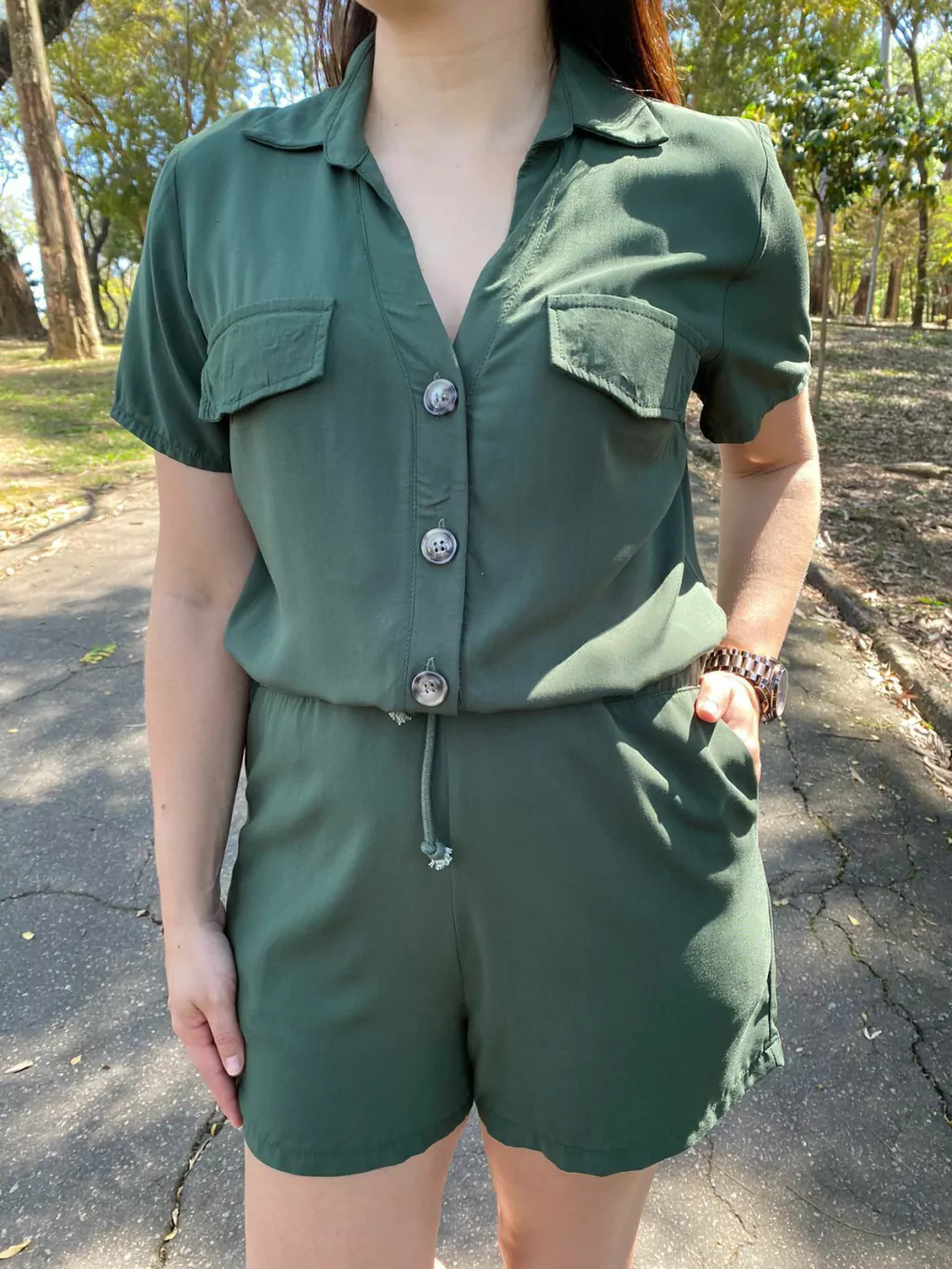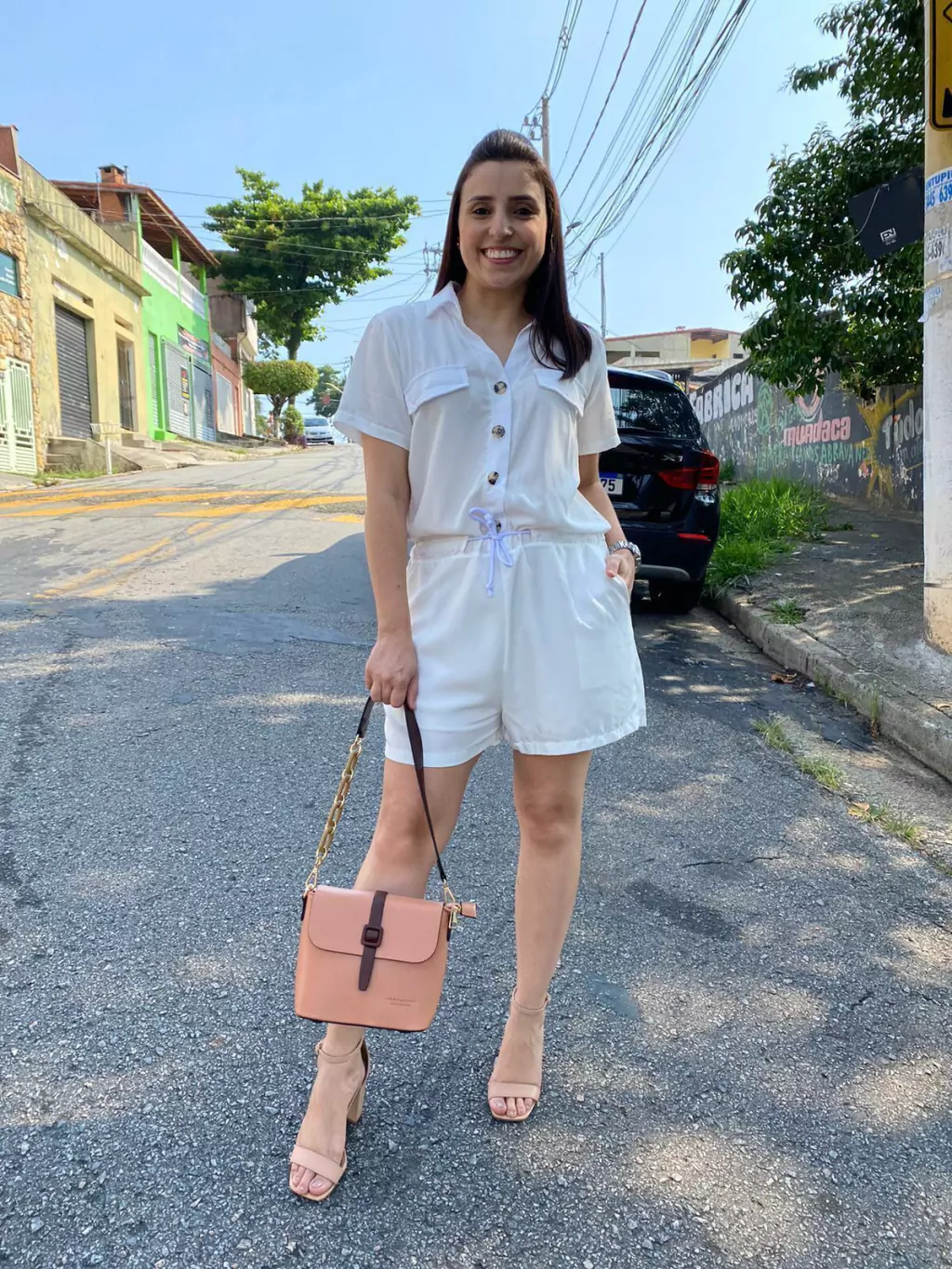 O Macaquinho Nanda é fabricado no viscose, deixando assim a peça com caimento leve contém botões na parte do busto e bolsos na parte do shorts e detalhe de amarração na cintura .