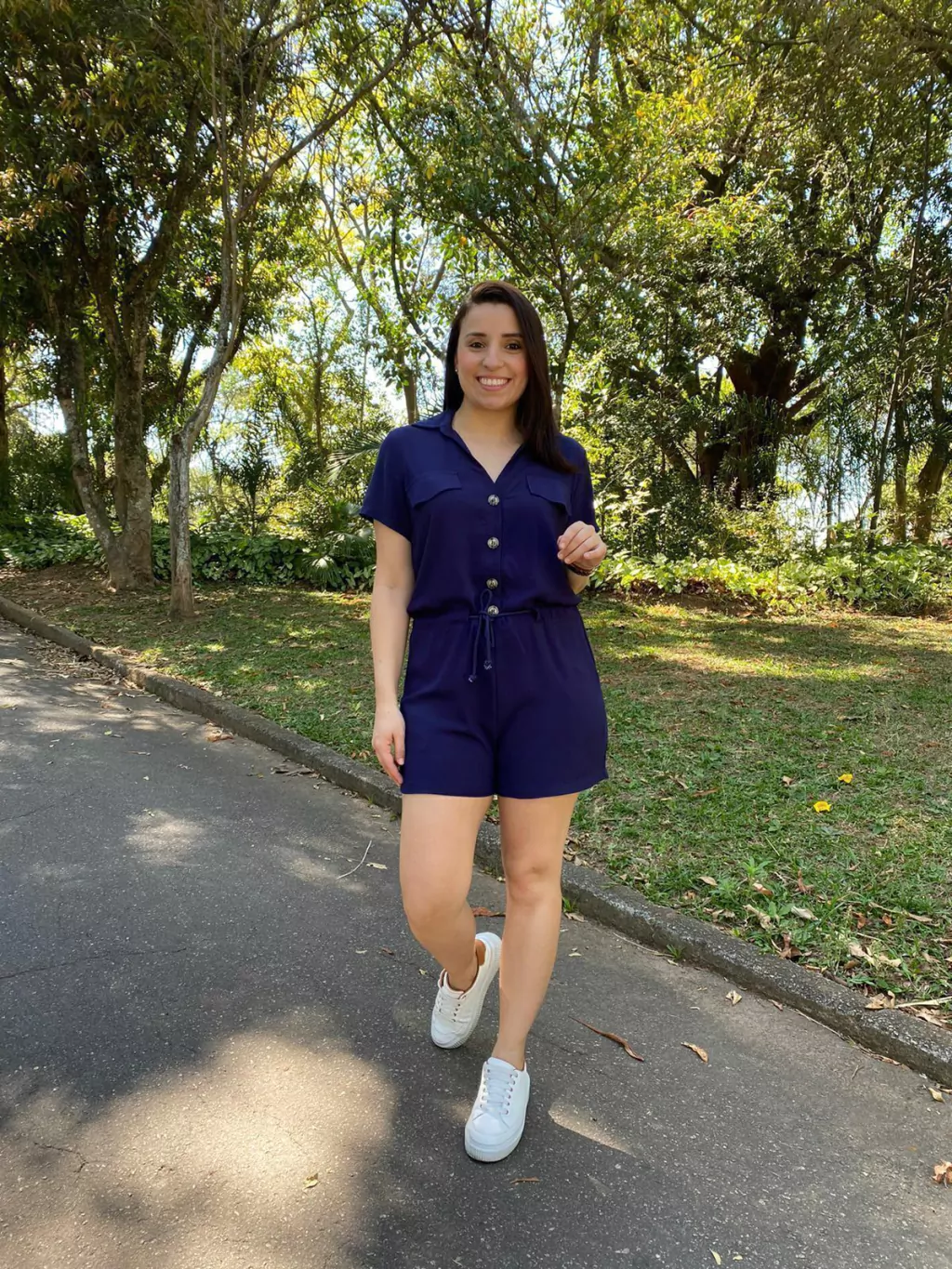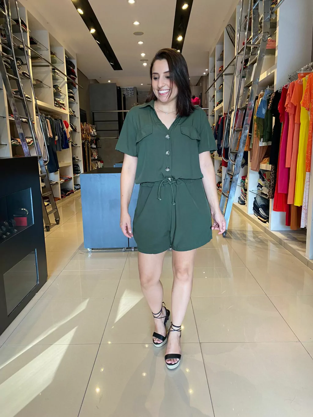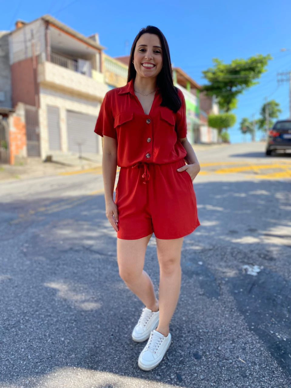 O Macaquinho Nanda é fabricado no viscose, deixando assim a peça com caimento leve contém botões na parte do busto e bolsos na parte do shorts e detalhe de amarração na cintura .