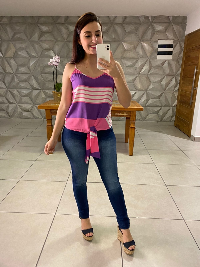 A Regata Bia é fabricada em tecido 100% Viscose com estampas em listras de diferentes tamanhos, contém alcinhas com regulagem para melhor ajuste no corpo e detalhe de amarração que trazem um ar moderno a peça.