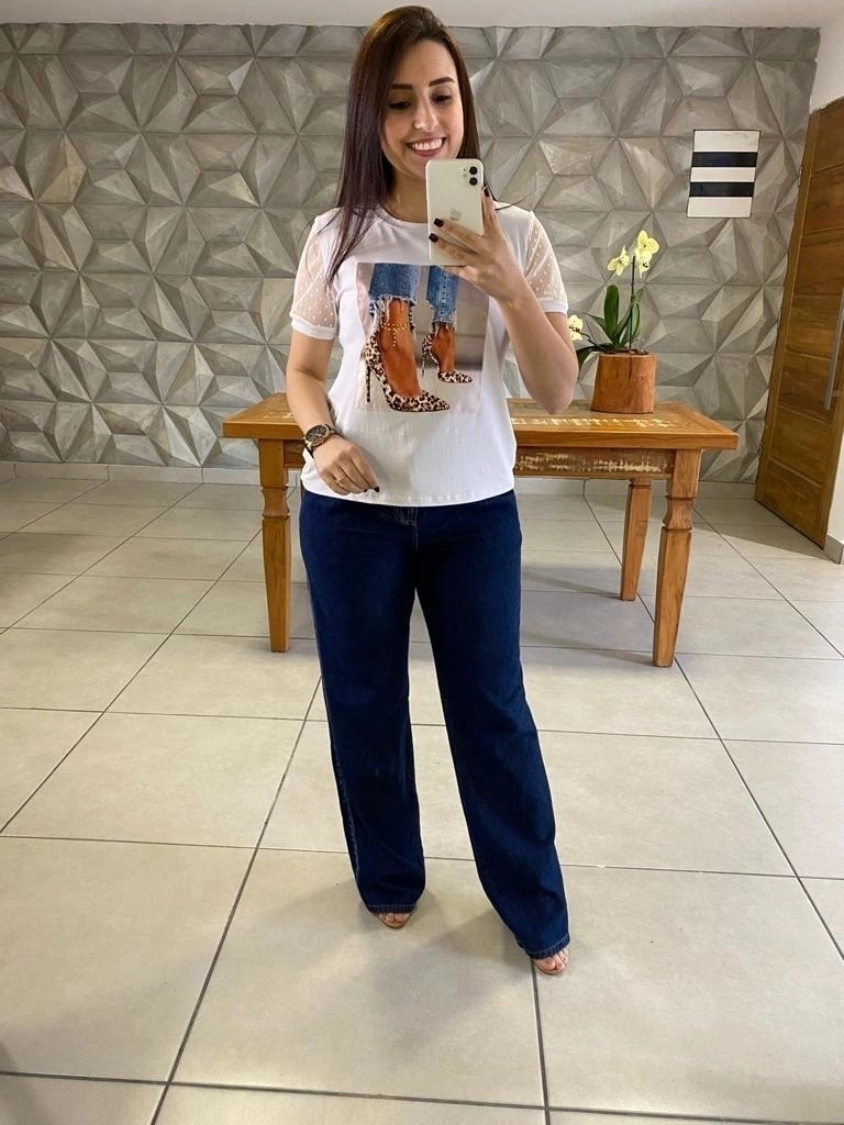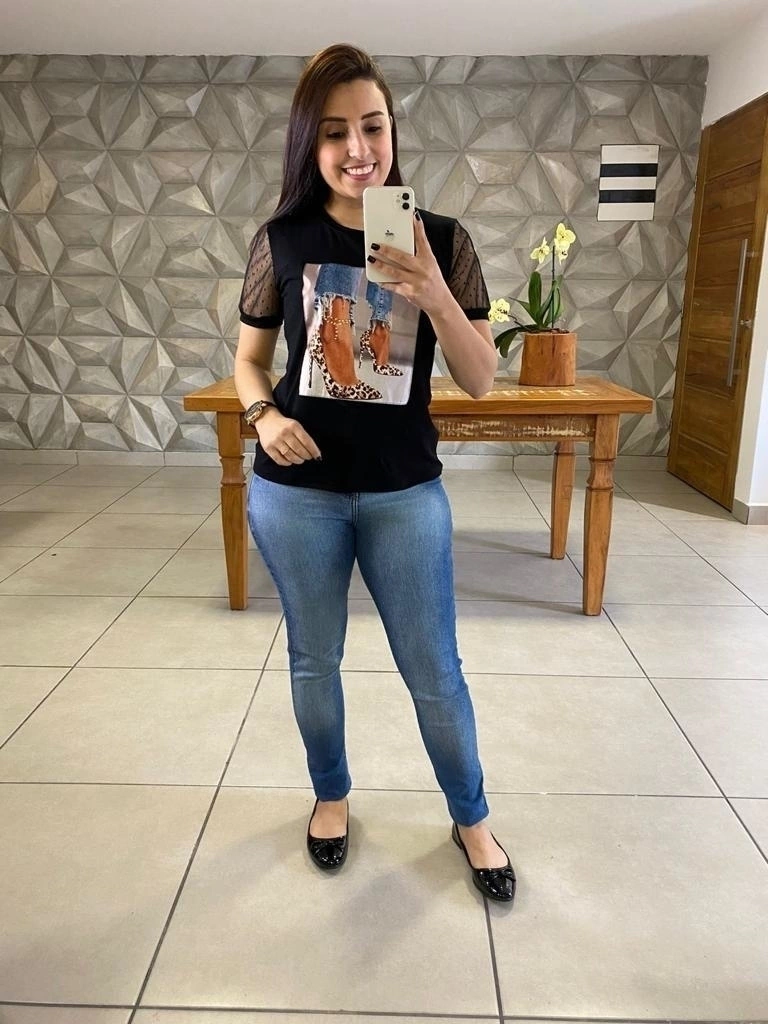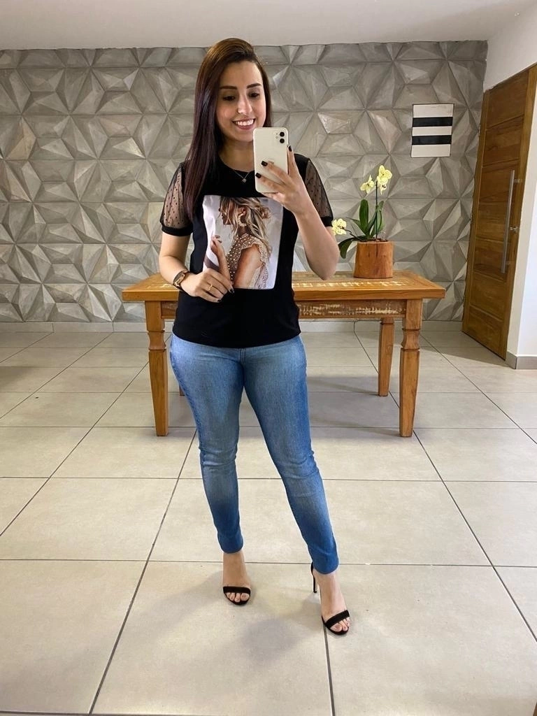 A T-shirt Tânia é fabricada em malha viscolycra de 95% Viscose e 5% Elastano e as mangas em tule 100% poliester, possui detalhe de aplique com desenhos lindos.