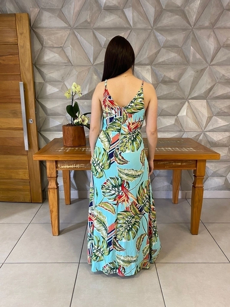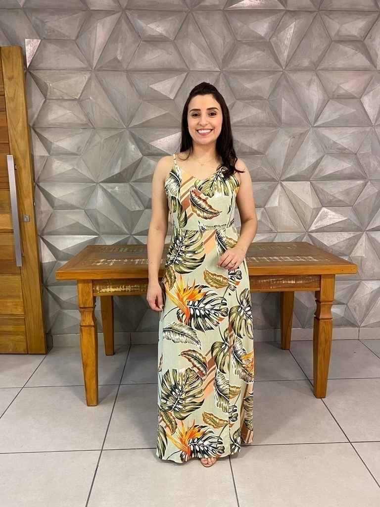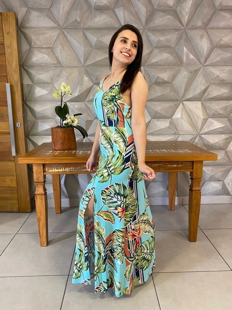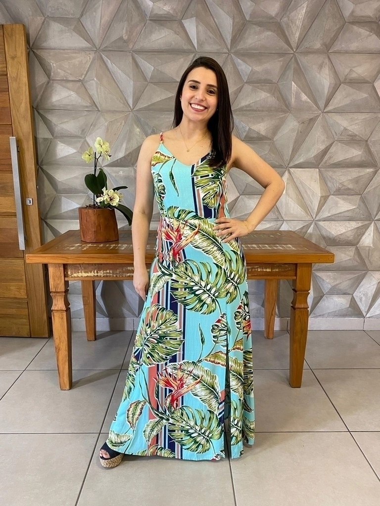 O Vestido Helena tem o decote em V e é fabricado em tecido 100% viscose com um toque macio e estampas lindas para o verão,contém regulagem nas alças que ajuda no ajuste, o detalhe de fenda na perna esquerda da um toque especial para o modelo .