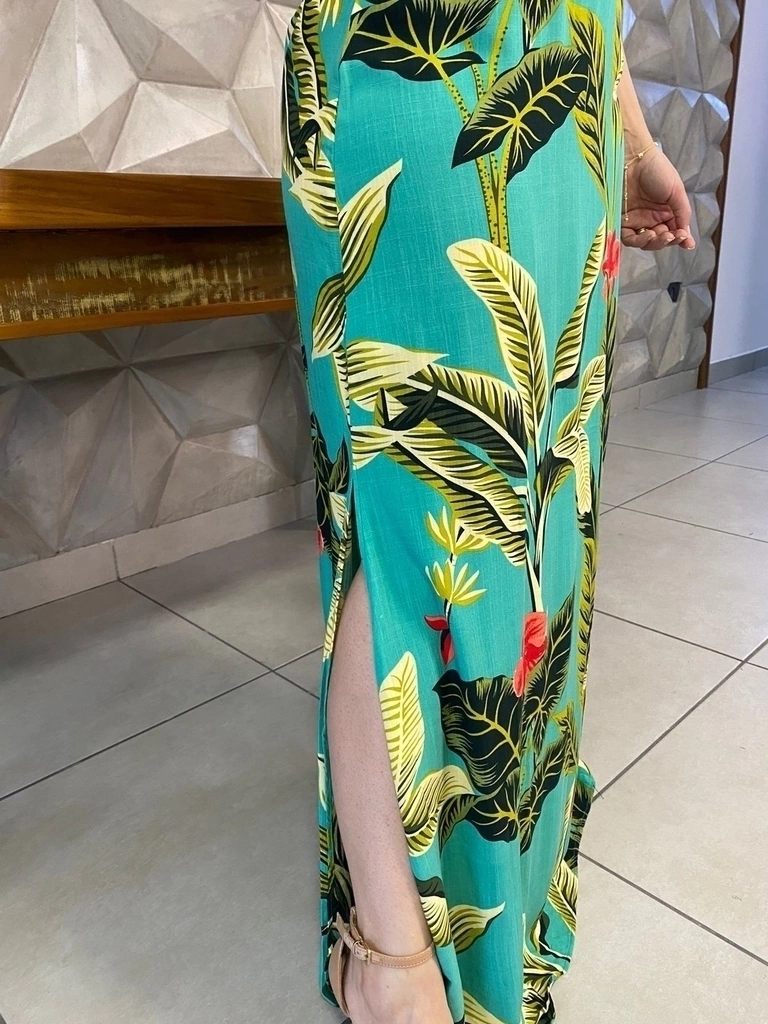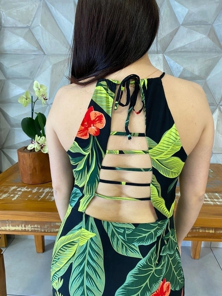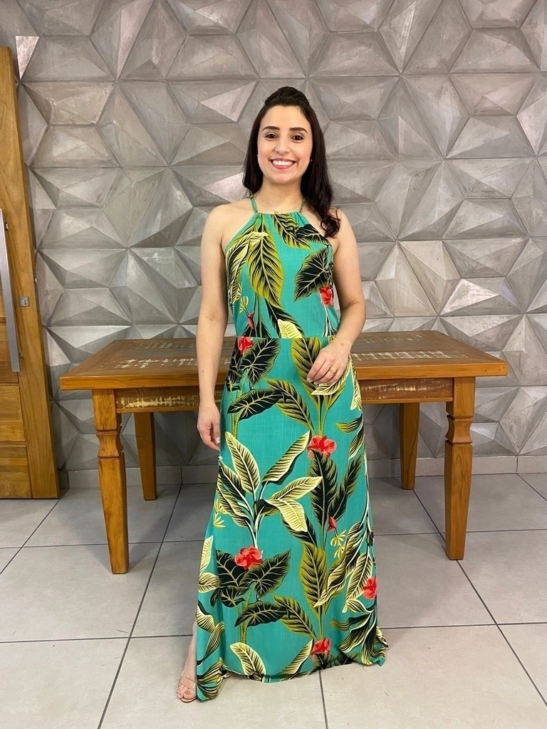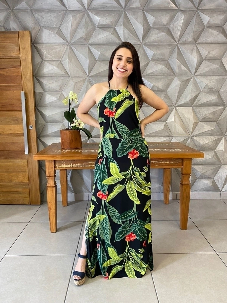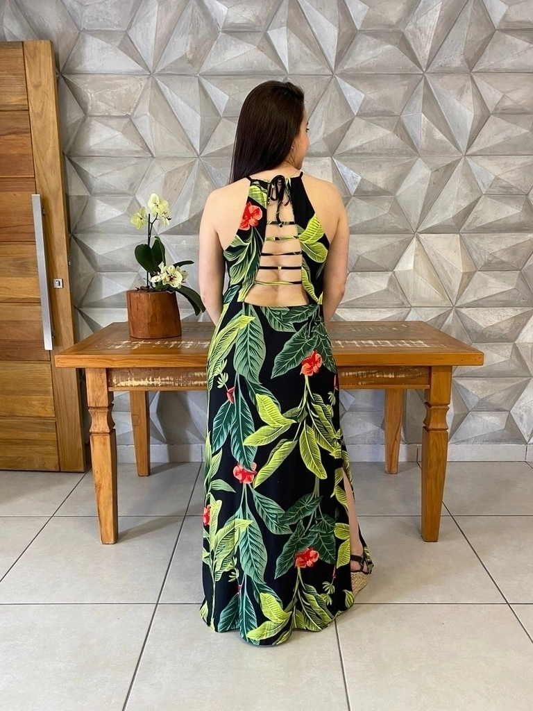 O Vestido longo Lara é fabricado em tecido 100% Viscose com estampas lindas , contém regulador nas alcinhas para melhor ajuste, e tem fenda nas duas laterais, o detalhe nas costas é um verdadeiro charme .